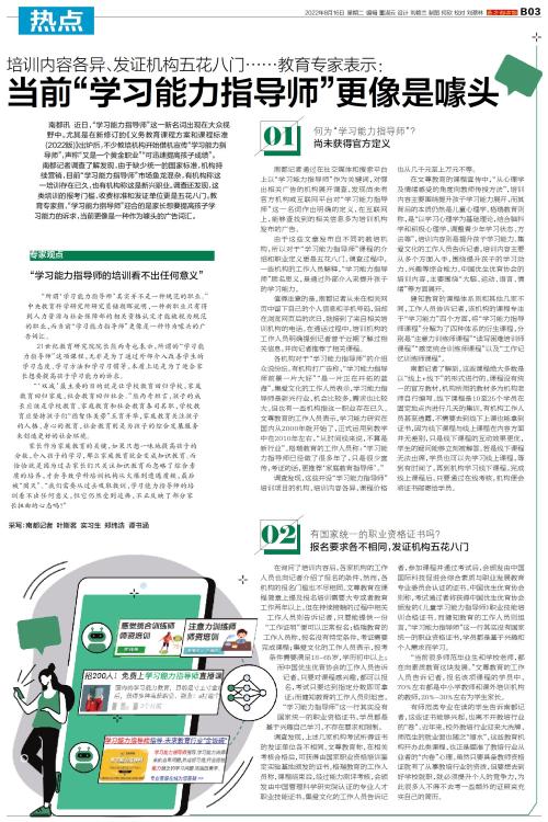南都讯 近日,“学习能力指导师”这一新名词出现在大众视野中。尤其是在新修订的《义务教育课程方案和课程标准(2022版)》出炉后,不少教培机构开始借机宣传“学习能力指导师”,声称“又是一个黄金职业”