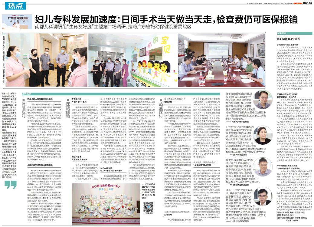 8月11日,南都儿科调研组走进广东省妇幼保健院番禺院区,进行了“生育友好度”主题的第二场实地调研。调研组由广州市人大代表曾德雄、徐嵩,广州市政协委员谭国戬、郑子殷,以及南都教育健康新闻部相关人员组