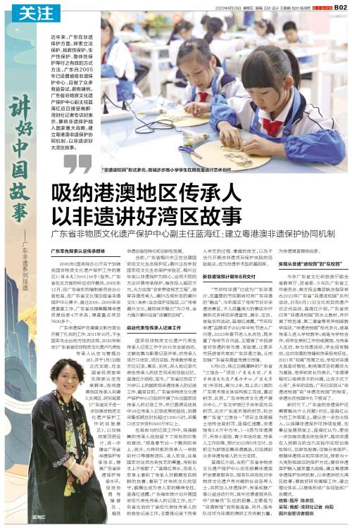 近年来,广东在非遗保护方面,探索立法保护、抢救性保护、生产性保护、整体性保护等行之有效的方式方法。广东自2005年已设置省级非遗保护中心,且做了众多有益尝试,颇有建树。广东省非物质文化遗产保护中心副主任蓝海红近日接受南都·湾财社记者专访时表示,要将非遗保护融入国家重大战略,建立粤港澳非遗保护协同机制,以非遗讲好大湾区故事。