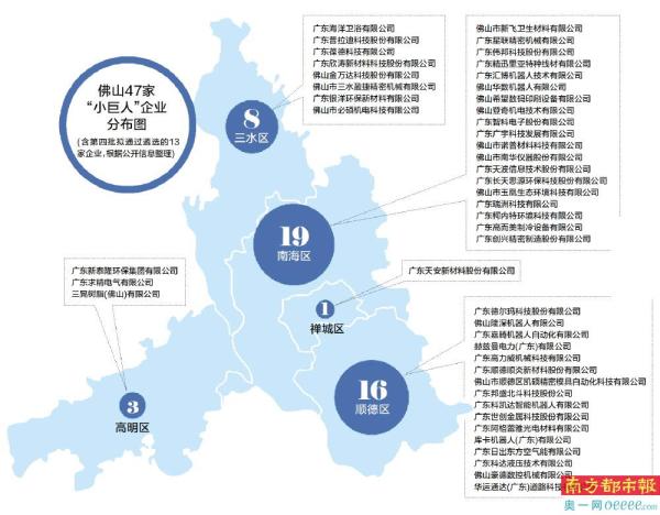 南都记者梳理了各类公开信息和“企查查”等渠道,根据47家企业注册地点进行不完全统计,南海区的“小巨人”数量最多有19家,其次是顺德区有16家,排在第三的是三水区有8家,此外高明区有3家,禅城区1家。