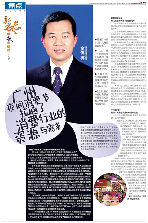 人物 ●琶醍3.0版本,是“文商旅融合街区”。 ●三届“Young城Yeah市”夜间消费节活动中,有两届都在珠江琶醍举办启动仪式。 ●今年7月,珠江琶醍客流量突破38万人次,环比6月