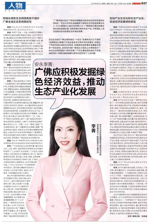 李菁 安永大中华区金融服务气候变化与可持续发展合伙人、ESG管理办公室主任 “广佛同城化包含了两地环境要素自由流动和自然资源的协同保护。”安永大中华区金融服务气候变