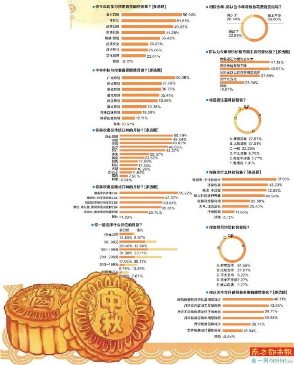 另一方面,今年消费者买月饼更看重食材口味和性价比。根据调查结果,食材口味和性价比等因素占比较高,分别占56.94%、51.81%;其次是品牌口碑、低糖低脂等,分别占49.03%、41.38%,考虑包装/颜值因素的受访者占36.42%。