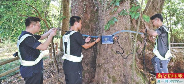 惠州市龙门县渡头村一棵直径约8米的老秋枫树边,广州市林业和园林科学研究院植物保护研究所的几位工作人员将监测仪器挂在树上。不远处,该所技术服务总监唐立鸿则盯着一块电子屏。作为专门给树看病的“树医生”,他们正在监测由仪器传导回来的数据和图像,为这株古树“诊断”。