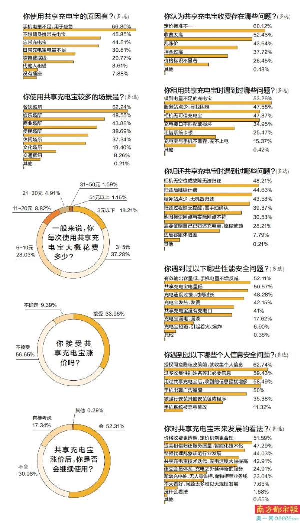 纵观调查结果,目前我国智能手机已经全面普及,使用场景非常广泛,共享充电宝让人们可以租用应急,避免手机没电而耽误事情,可以缓解充电焦虑,确实有存在和增长的市场空间。但是,共享充电宝蓬勃发展的同时伴随着诸多问题,共享充电宝定价不一,服务水平和消费体验没有太大的提升,整体消费性价比越来越低,安全隐患日益凸显……在这样的发展困境尚未得到进一步解决的时候,共享充电宝却出现“涨价潮”,成为新的“刺客”,无疑是撞到了消费者的“枪口”上,不接受涨价就成为多数人的心声。
