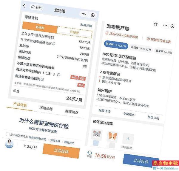 随着养宠人数增加,关于宠物的消费也多种多样。近期,“宠物保险”逐渐在市场上发展。在宠物主看来,宠物得病或受伤而产生的医治费用都相对高昂,为宠物买一份保险,无疑能够减轻长期养宠的负担。南都记者调查发现,目前国内多个保险公司已推出宠物保险的相关业务,归属于财产险的范畴,以互联网平台为推销主阵地。有专家认为,很多保险公司的宠物类保险尚属于试水阶段,消费者选择时要详细了解,避免遇到投保后出现难赔付的情况。
