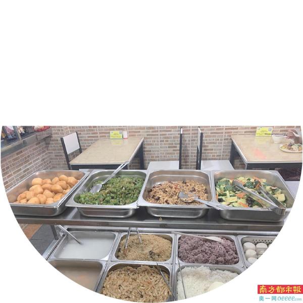 弘善素食店位于南华中路247号,在海幢寺的斜对面。临街的店铺不大,刚能挤下8张桌子,冬瓜、土豆、茄子……店铺中央位置摆着20多个品种的素食热菜和粥水。200多份“待用快餐”——白粥和素食盒饭整齐地摆在入口处,店长芳姐负责派发。