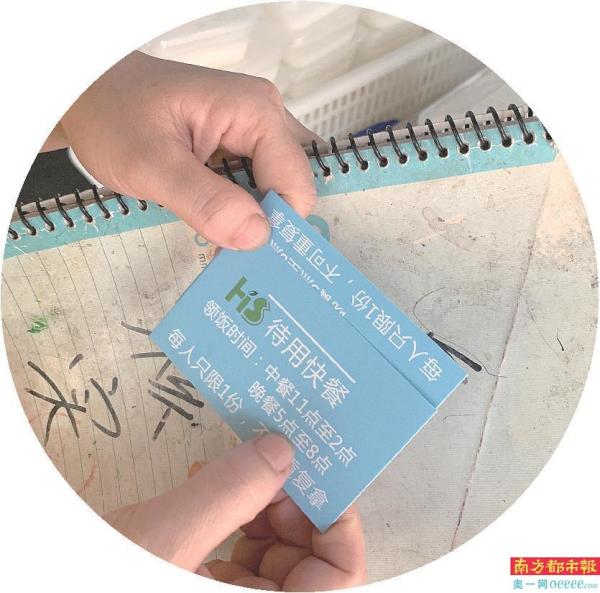 领待用快餐的,是芳姐熟悉的老面孔:附近的流浪者、靠低保金度日的耄耋老人、行动不便的残障街坊……他们只要凭低保证、残疾证等证件在素食店登记,日后即可凭店里提供的领餐证,每天中午、晚上两餐都能领到爱心餐。为方便保存领餐证,素食店还细心地给蓝色证件加装一个透明证件套,以及能挂在脖子上的便携带子。
