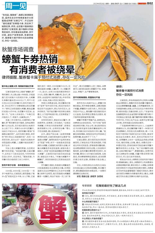 “秋风起,蟹脚痒”,南都记者调查发现,虽然在走访中有商家表示大闸蟹离成熟期“还差口气”,不过宣称“随吃随提”的螃蟹卡券,则迎来了销售旺季。然而,这些蟹卡蟹券真的靠谱吗?记者发现,蟹卡蟹券火热销售的