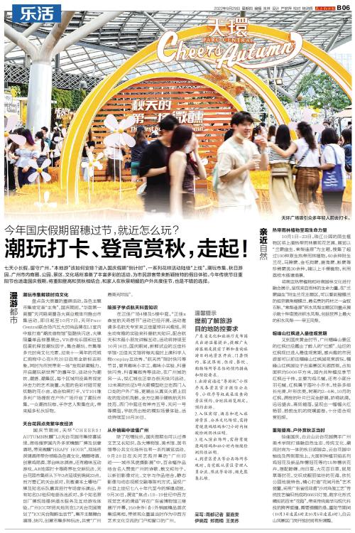 七天小长假,留守广州,“本地游”该如何安排?进入国庆假期“倒计时”,一系列花样活动陆续“上线”。潮玩市集、秋日游园,广州市内商圈、公园、景区、文化场所准备了丰富多彩的活动,为市民游客带来新颖独特的假日体验。今年传统节日重阳节也适逢国庆假期,将重阳登高和赏秋相结合,和家人在秋景明媚的户外共度佳节,也是不错的选择。