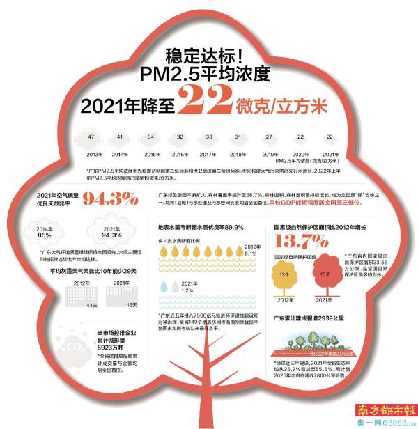 梳理发现,2021年全省城市(县城)污水处理能力达2947万吨/日,污水管网长度为7.34万公里,均居全国首位。全省空气质量优良天数比率为94.3%,PM2.5平均浓度降至22微克/立方米,率先构建大气污染防治先行示范区。珠三角九市全部纳入国家“无废城市”建设。