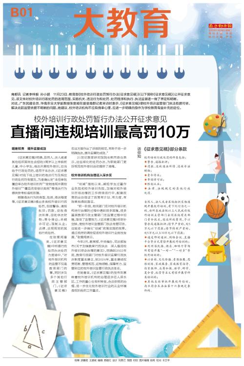 南都讯 记者李梓毅 孙小鹏 11月23日,教育部《校外培训行政处罚暂行办法(征求意见稿)》(以下简称《征求意见稿》)公开征求意见。该文件对校外培训行政处罚的适用范围、实施机关、违法行为和处罚、处罚