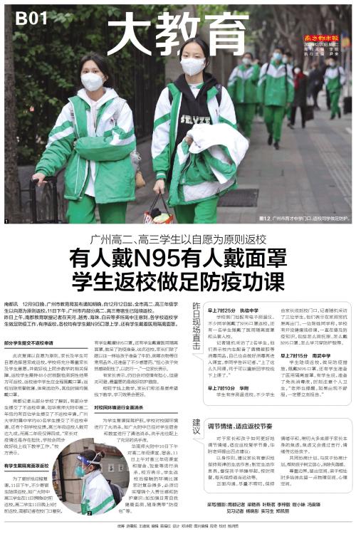 南都讯 12月9日晚,广州市教育局发布通知明确,自12月12日起,全市高二、高三年级学生以自愿为原则返校。11日下午,广州市内部分高二、高三寄宿生已陆续返校。 昨日上午,南都教育联盟记者在天河、