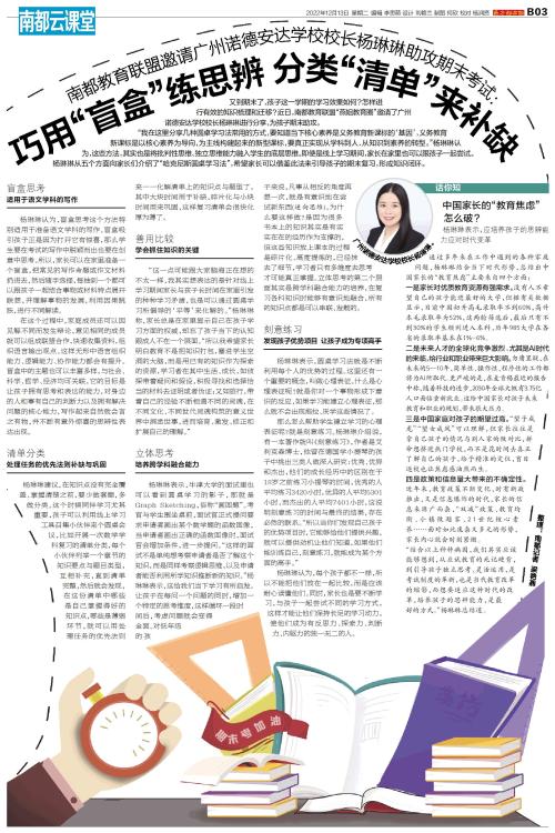 又到期末了,孩子这一学期的学习效果如何?怎样进行有效的知识梳理和迁移?近日,南都教育联盟“燕姐教育圈”邀请了广州诺德安达学校校长杨琳琳进行分享,为孩子期末助攻。 “我在这里分享几种圆桌学习法常用