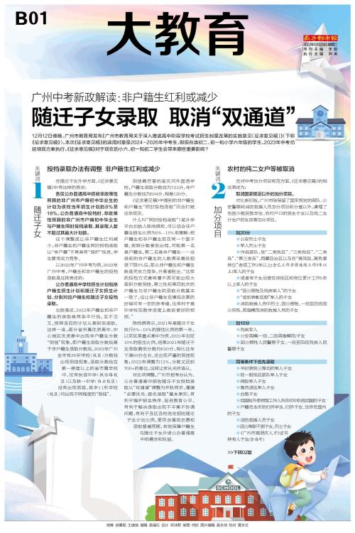 12月12日傍晚,广州市教育局发布《广州市教育局关于深入推进高中阶段学校考试招生制度改革的实施意见(征求意见稿)》(下称《征求意见稿》)。本次《征求意见稿》的适用对象是2024~2026年中考生,