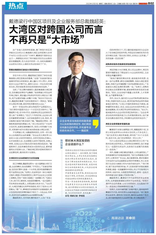 高端访谈 由广东省人民政府和香港、澳门特别行政区政府联合主办的2022粤港澳大湾区全球招商大会将于本月21日至22日在广州举行。戴德梁行是参会企业之一,南都就此采访了其中国区项目及企业