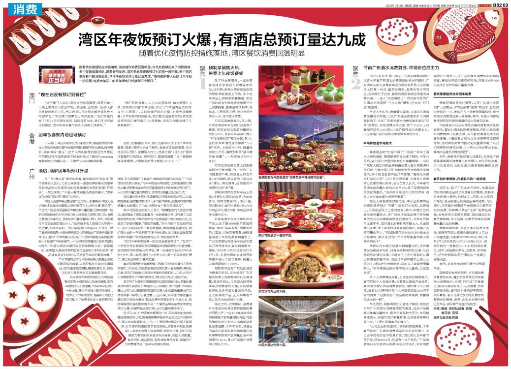随着优化疫情防控措施落地,湾区餐饮消费回温明显。在元旦假期迎来了消费高峰,多个餐馆排满长队。随着春节临近,湾区多地年夜饭预订也迎来一波热潮。多个酒店看好春节的消费趋势,今年年夜饭总预订量已达九成,“也有很多客人在预订大年初一的位置,包括大年初二的开年饭也已经接到不少预订。”