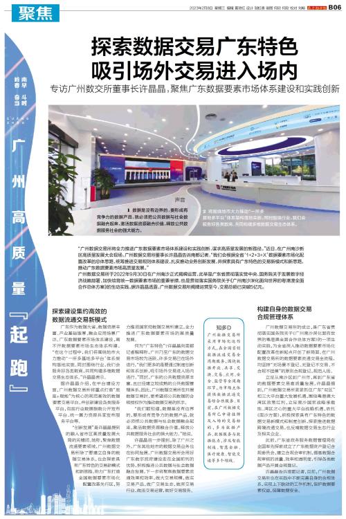 “广州数据交易所将全力推进广东数据要素市场体系建设和实践创新,谋求高质量发展的新路径。”近日,在广州南沙新区高质量发展大会现场,广州数据交易所董事长许晶晶告诉南都记者,“我们会根据全省‘1+2+3