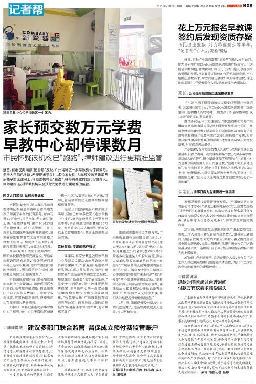 近日,有市民向南都“记者帮”反映,广州海珠区一家早教机构停课数月,负责人目前已失联,希望记者帮关注。多位家长称,去年预交数万元学费后孩子却无课可上,怀疑该机构已“跑路”,呼吁有关政府部门尽快介入。