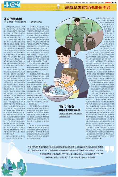 为充分挖掘生态文明建设中水与社会发展的丰富内涵,提高公众对自来水的认识,重视水资源保护,广州水投自来水公司、南方都市报南都教育联盟及南都校探联合开展“滴滴自来水 绵绵羊城情”自来水有奖征文。经过2