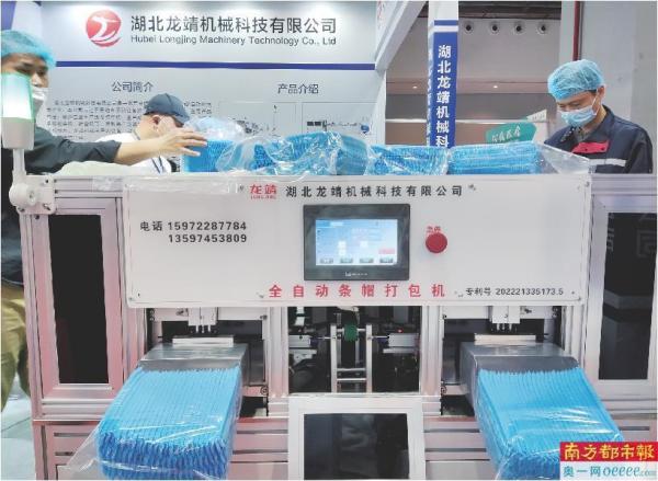 作为全国第一家生产全自动条帽打包机的湖北龙靖机械科技有限公司,此次参展带来了一台价值13万元左右的产品。据公司总经理杨代波介绍,目前口罩的需求已经在放缓,增长空间在缩小,“但条帽就不一样,条帽的需求在增加,所以我们才主力去研发这款全自动条帽打包机。此次来广州,就是想借参展机会向广东、向全国推广这款机器,目前我们在湖北已经接到了订单,希望能在广州、广东也接到订单。”