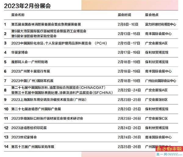 而北京九州尚阳科技有限公司带来的脉冲气压喷雾水枪,发射出口速度达到每秒120米的水雾,喷射距离可达20米以上。可瞬间同步完成脉冲冲击,雾化吸热,隔绝氧气,是目前最先进的高效节能环保的以水灭火装备。从已公布的展会信息来看,今年一季度举办的50多场展会以行业展为主,涵盖了工业、汽车、家具、美容、医疗、设计、食品、动漫等多个领域。对此,广州国际会议展览业协会相关负责人表示,一季度广州计划举办的展会中,不管是展会面积、行业影响力,有许多展会都有着举足轻重的地位。“如2月15日广交会展馆开年首展的2023中国国际化妆品、个人及家庭护理用品原料展览会,展会面积约5万多平方米。3月3日有着中国第一个设计周称号的‘广州设计周’,展会面积约18万平方米。3月10日在广交会展馆举办的‘美博会’,展会面积超20万平方米。而3月18日举办的中国国际家博会,更是全球规模最大、品质和影响力首屈一指且目前全球唯一以全题材、全产业链为鲜明特色的大家居博览会。”这些大型且影响力强的展会,为广州会展业的复苏打响了头炮。