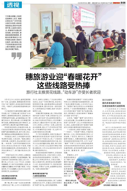 三月春光明媚,正是赏花踏春时。近日,南都记者走访广州市内各大旅行社发现,前来咨询报团出游的市民络绎不绝,以退休长者为主。多家旅行社推出赏花线路、动车线路、旅居类线路招揽顾客,多数市民更青睐五六天行