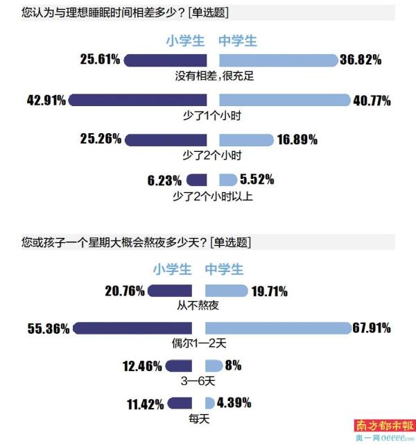 中学生认为每日应至少保证8小时的睡眠时间:实际睡眠时间7-8小时的受访中学生中,有52.53%的人认为比理想睡眠时间少了1小时。此外,与个人在小学时的睡眠时间相比,有35.25%的中学生认为睡眠时间比以往变少了1小时,还有20.5%的中学生感觉少了2个小时以上。