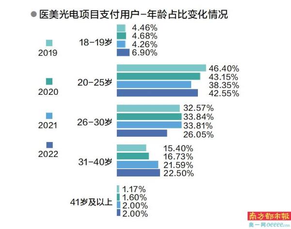 2019-2022年间,20岁-25岁的年龄群体占比分别为46.40%、43.15%、38.35%、42.55%,连年高于其他年龄段群体。与此同时,31-40岁用户群体占比趋势逐年增加,从2019年的15.40%上升至2022年的22.50%,增势显著,医美光电熟龄化趋势明显。