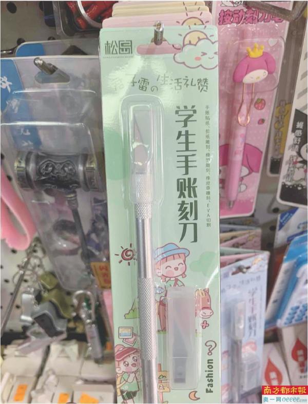 越秀区一小学对面马路上,共有3家文具店,距离学校大门口不足20米。其中两家店均销售刻刀笔,刻刀笔与普通的中性笔、圆珠笔摆放在一起,并不起眼,不仔细看不易察觉。但只要问老板“有刻刀笔吗?”对方心领神会翻出刻刀笔,刻刀笔外面套着塑料外壳包装,包装盒上写着“学生手账刻刀”,外形类似普通笔,但笔端露出的不是笔芯,而是约3厘米长、呈三角形的锋利刀刃,并随产品附赠5个可拆卸的刀片,价格约7元,产品包装上注明“不适合3岁以下儿童使用”。据老板声称,该款产品卖得很好,“主要是学生做手工、美工,买的人一般是大点的孩子。”