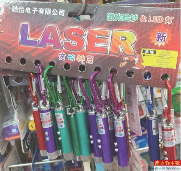 激光笔的外包装上注明“宠物神器”“激光验钞”“LED灯”,并有“危险”提示语,“激光辐射、避免眼睛直视”“不建议12岁以下儿童使用”。事实上,南都记者见到学生只要花钱,就能轻松买到激光笔,老板并不会加以制止。一名小学男生花25元购买一支大激光笔,他自称“晚上遛宠物用,大的更好一些”。