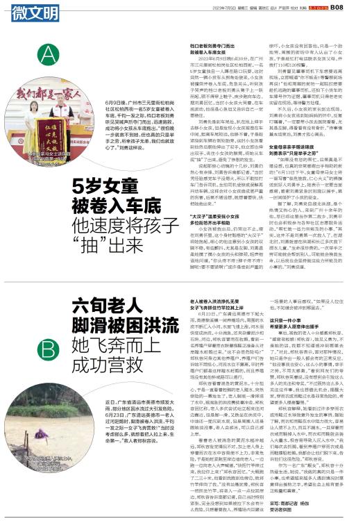 6月9日晚,广州市三元里街松柏岗社区松柏西街一名5岁女童被卷入车底,千钧一发之际,档口老板刘勇听见哭喊声后夺门而出,迅速施救,成功将小女孩从车底抱出。“很怕晚一步就救不到她,但也真的只是举手之劳,