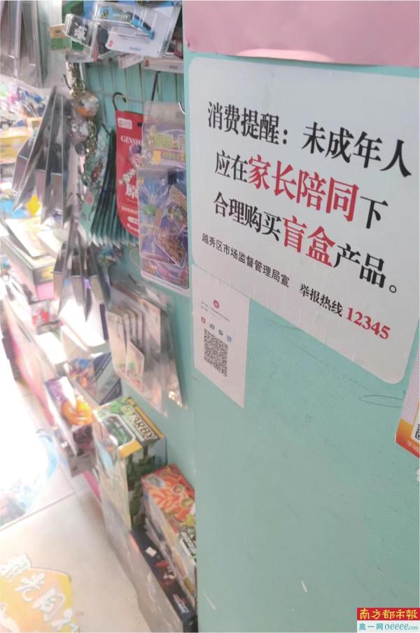 除了前述东山口一所小学附近的书店贴有消费提醒外,南都湾财社记者在广州越秀区东山口走访时看到,该区域多个售卖盲盒产品的店铺中,同样也有越秀区市场监督管理局所统一发放的盲盒消费提醒。