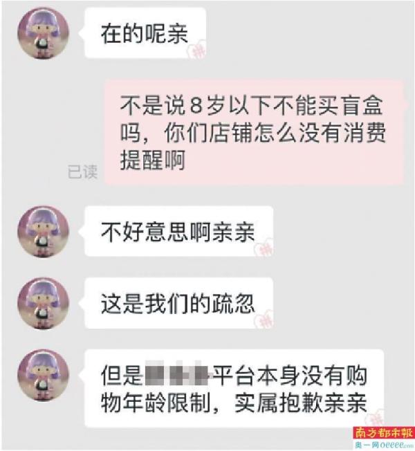 与此同时,仍有不少盲盒网店并未设置任何消费提醒。南都湾财社记者向某电商平台一家盲盒专卖店客服了解情况,对此,该店客服表示是一时疏忽所致,但其还表示,实际上该电商平台本身也并没有购物年龄限制。对此,南都湾财社记者向平台官方客服了解情况,确认情况属实。