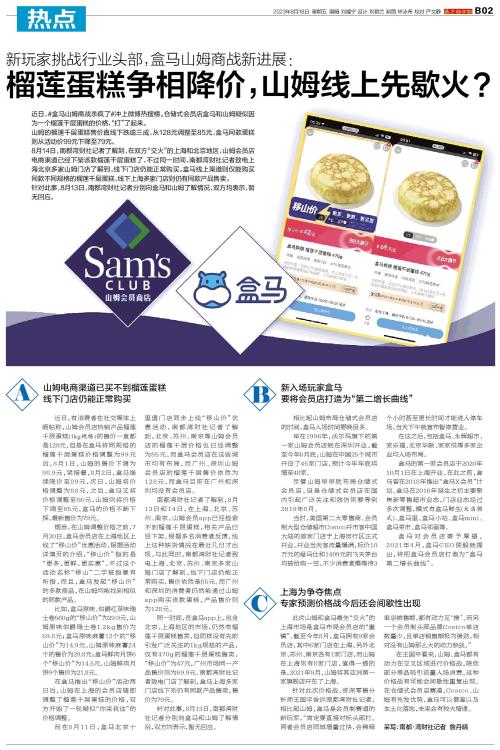 近日,#盒马山姆商战杀疯了#冲上微博热搜榜。仓储式会员店盒马和山姆疑似因为一个榴莲千层蛋糕的价格,“打”了起来。 山姆的榴莲千层蛋糕售价直线下跌逾三成,从128元调整至85元,盒马同款蛋糕则从活