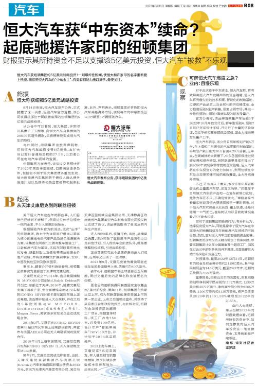 恒大汽车获纽顿集团约5亿美元战略投资!一则爆炸性新闻,使恒大和许家印的名字重新登上热搜。而投资恒大汽车的“中东金主”,究竟有何能力施以援手,备受关注。 A 施援 恒大称获纽顿5亿美元战略投资