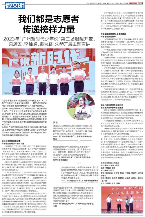 传承志愿服务精神,彰显新时代少年担当。近日,2023年“广州新时代少年说”系列活动——第二场主题宣讲“践行雷锋精神·服务奉献社会”在广州图书馆举行。 活动由广州市文明办主办,广州图书馆协办,南方