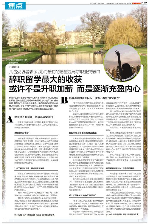 <<上接01版 你为什么会辞职留学?每个人都有不同的回答,但几位受访者都说,刚开始是因为遭遇职业瓶颈期,所以想换工作、升职加薪,甚至转行。虽然最终结果不一定按照最初的设想去发展,但她