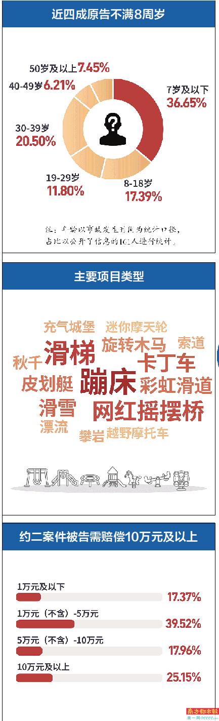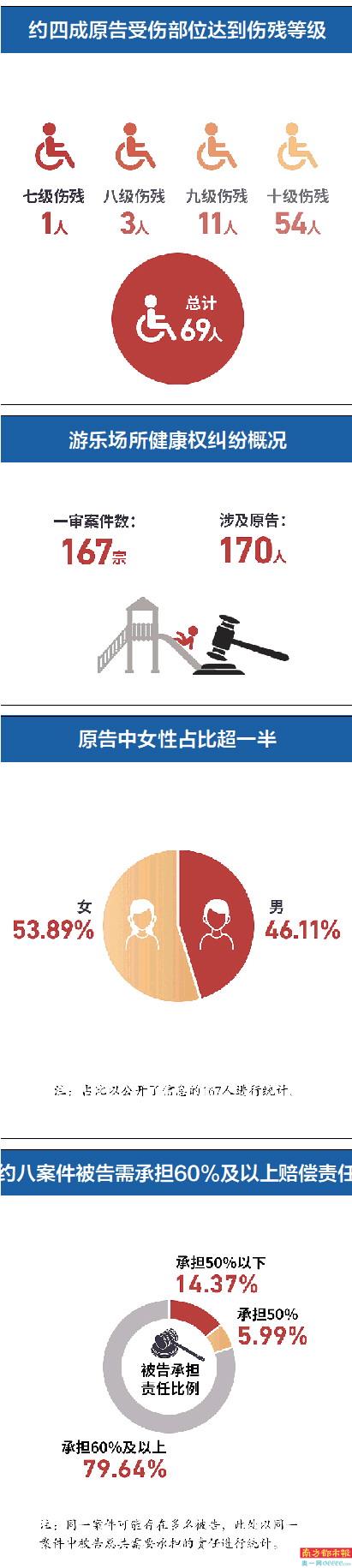南都记者通过中国裁判文书网梳理了2022年以来全国各级法院审结的167宗在游乐场所游玩过程中受伤而引起的健康权民事纠纷。分析结果显示,原告以未成年人为主,其中一半以上原告不足18周岁。此外,约两成原告受伤是因为游玩过程中与其他人发生碰撞、被对方推倒等原因造成的。