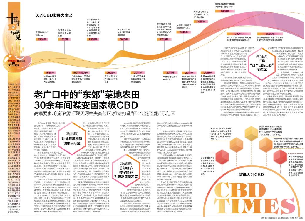 伴随着“六运会”“九运会”和第十六届亚运会的成功举办,天河中央商务区(下称“天河CBD”)自北向南逐步发展成型。老广们口中曾经的“东郊”菜地农田,经过30多年的发展,成为华南地区城市化发展水平最高