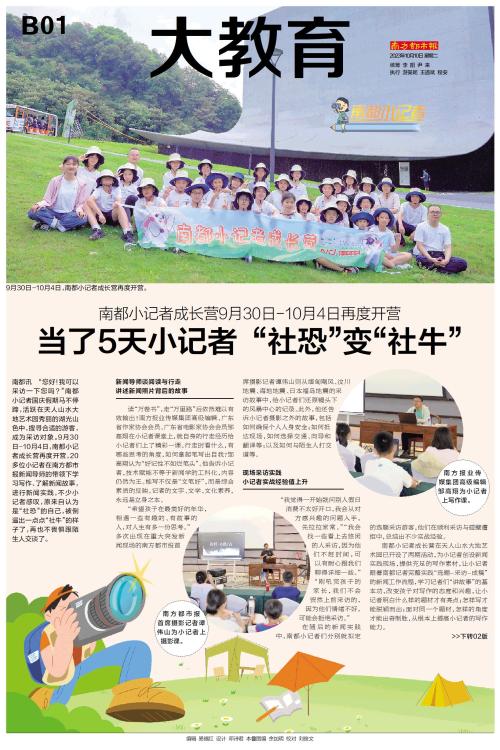 南都讯 “您好!我可以采访一下您吗?”南都小记者国庆假期马不停蹄,活跃在天人山水大地艺术园秀丽的湖光山色中,搜寻合适的游客,成为采访对象。9月30日-10月4日,南都小记者成长营再度开营,20多位
