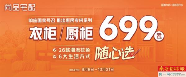 据介绍,为响应国家政策,助力家居消费提质升级,尚品宅配发布699惠民专供系列,该系列包括699元/㎡的衣柜、699元/m的厨柜,共有26款潮流花色可供选择,优选环保健康好板材,加厚背板更稳固,严选优质五金配件,以实在的优配诚意惠民。即日起到10月31日期间,消费者以超值的价格就能挑选到自己心仪的家居产品,享受到大牌品质的全屋定制,实现美好生活。