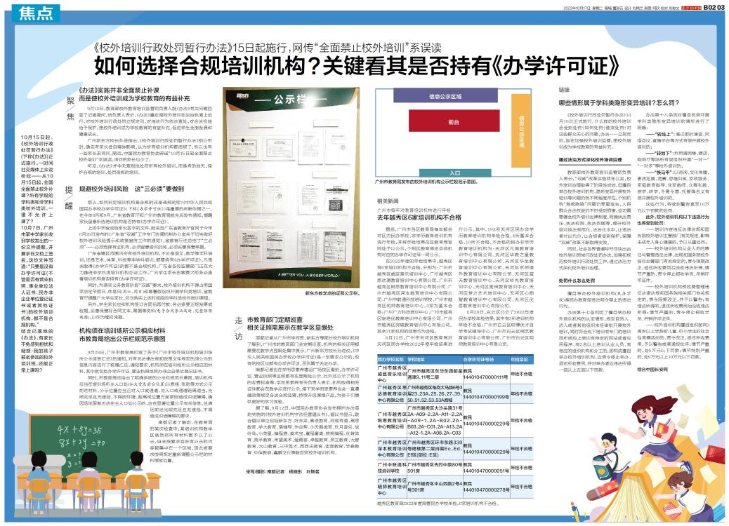 9月28日,广州市教育局印发了关于《广州市校外培训机构培训场所公示信息汇总》的通知,对有关法律法规和政策文件规定的须公示的信息内容进行了梳理汇总。通知要求,机构须在培训场所公示相应的材料,其中就包括办学许可证、营业执照或民办非企业单位登记证书。