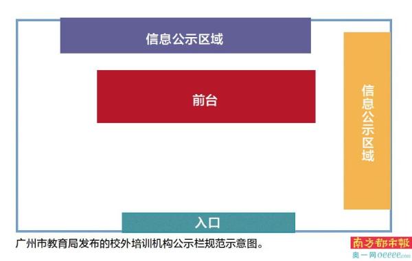 同时,市教育局还给出了明确详细的公示栏规范示意图。培训机构应当在培训场所主入口处(如大堂或前台位置)以悬挂、张贴等方式公示前述材料。公示位置应当正对入口或通道,与入口或通道距离适当,光照充足且无遮挡,不得因环境、距离或位置方面原因造成识读障碍。确因场地限制无法在主入口处公示的,应在显著位置公示有关信息,且满足前述光照充足且无遮挡、不得造成识读障碍的要求。