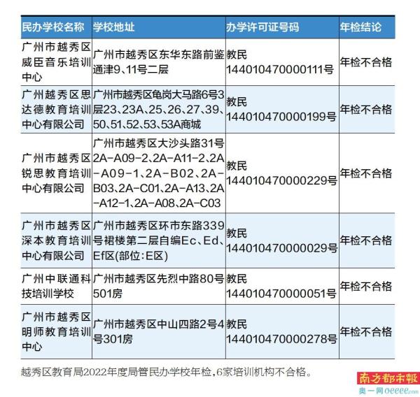 据悉,广州市各区教育局每年都会对区内民办学校、非学历教育培训机构进行年检,并将年检结果在区教育局官网处予以公示,个别区教育局还会将机构对应的办学许可证号一同公示。