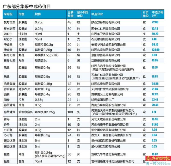 记者注意到,根据实施范围和采购量,品种范围为广东省参与的全国中成药联盟品种。清单显示,其药品包括复方斑蝥胶囊、冠心宁注射液、华蟾素(片/胶囊)、接骨七厘(散/片/胶囊)、乐脉(胶囊/丸)、脉管复康(胶囊/片)、脑安(滴丸/胶囊/片/颗粒)、藤黄健骨(片/丸)、香丹注射液、心可舒(胶囊/片/颗粒)、银杏达莫注射液、振源(片/胶囊/口服液)。