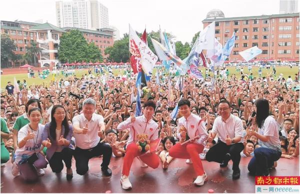 在执信中学执信路校区,亚运跳水男子双人三米板冠军何超、严思宇亮相。