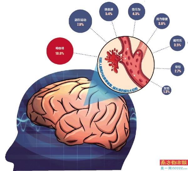 结果显示,引起人群颅内动脉瘤破裂、脑出血的前8大归因风险依次为:喝咖啡、剧烈运动、擤鼻涕、性行为、用力排便、喝可乐、受惊、发怒。这些诱发因素均可在短时间内使血压升高。