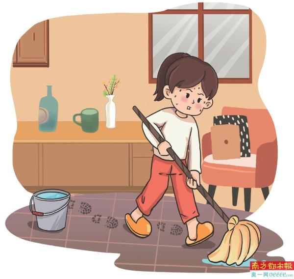 今天是国庆节,在家休息的我想为爸爸妈妈做一次家务劳动。我看脏兮兮的地板、布满了灰尘像张难看的大花脸,我决定给它“美容”一下。