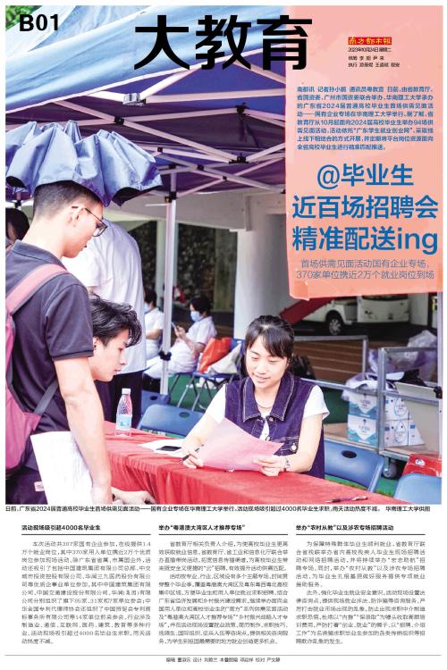 南都讯 记者孙小鹏 通讯员粤教宣 日前,由省教育厅、省国资委、广州市国资委联合举办,华南理工大学承办的广东省2024届普通高校毕业生首场供需见面活动——国有企业专场在华南理工大学举行。据了解,省教